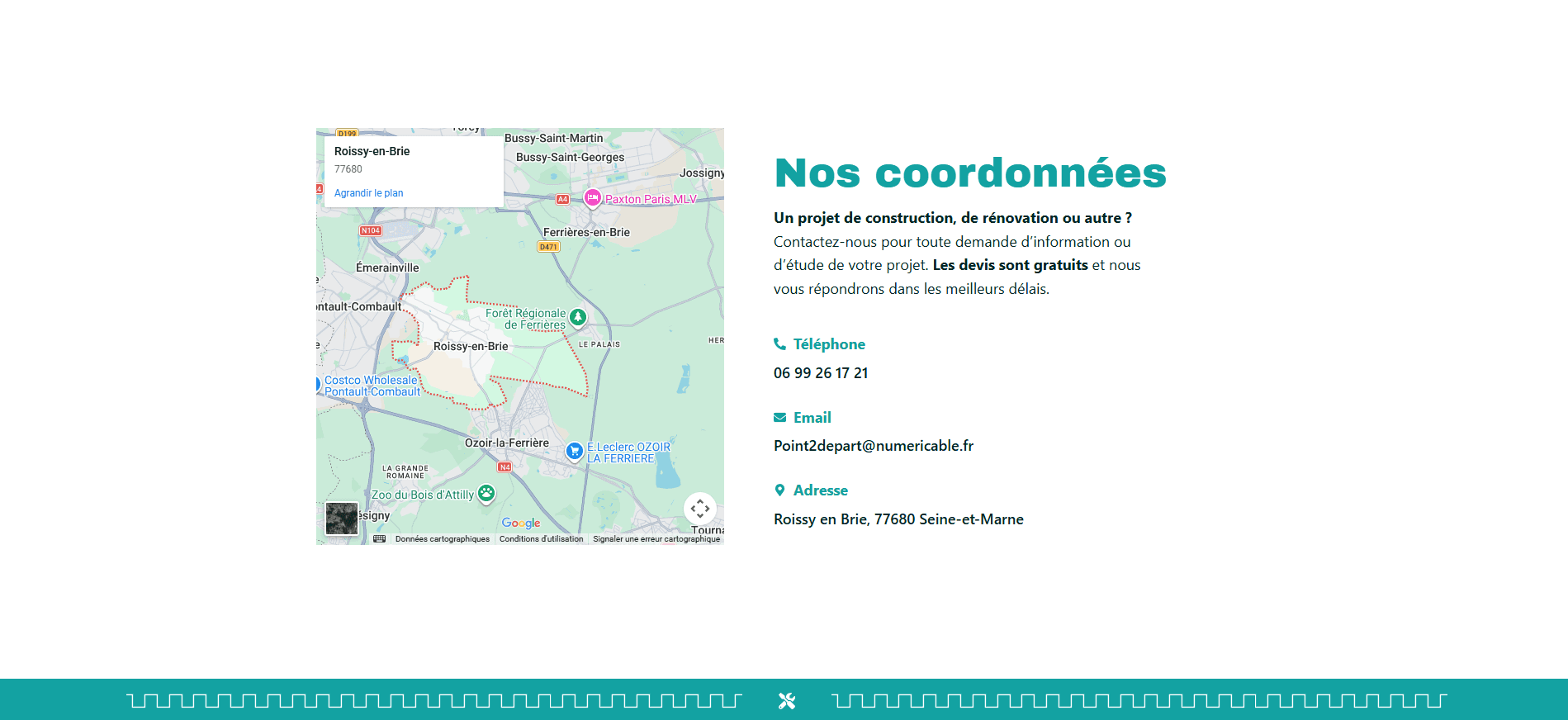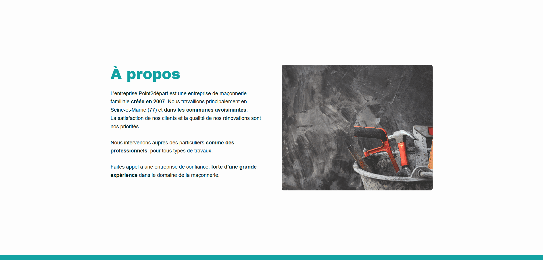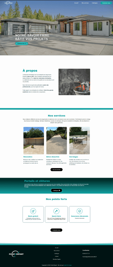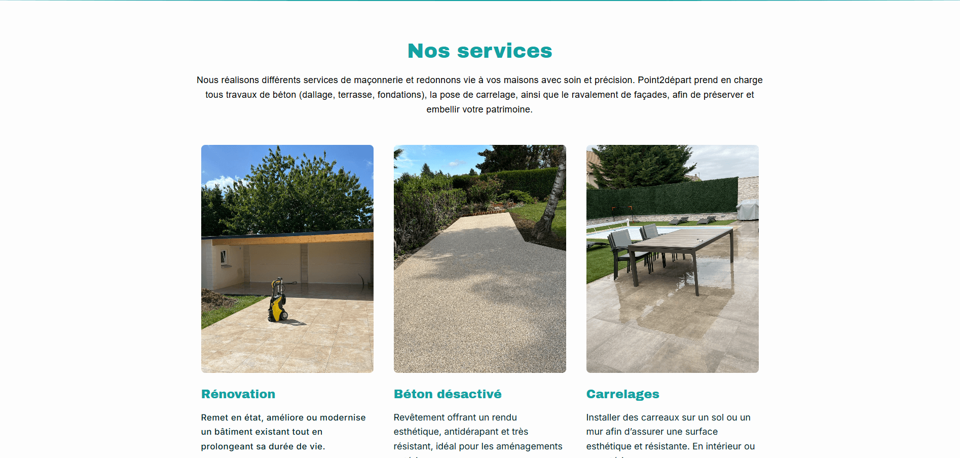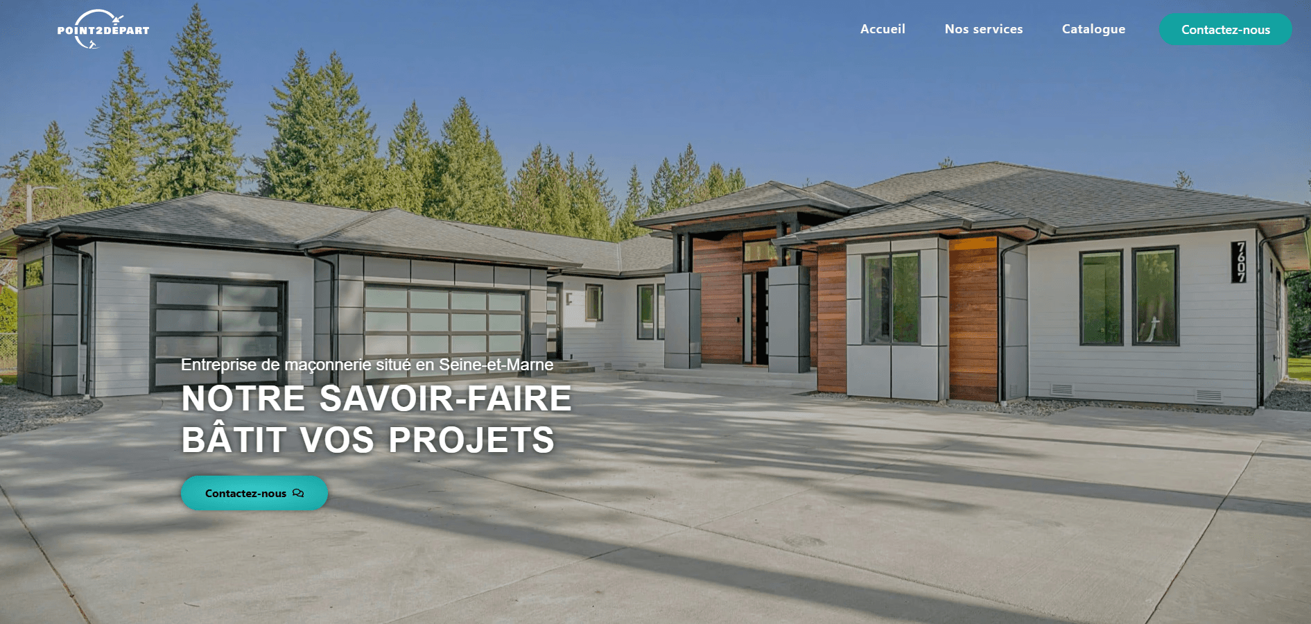 L'entreprise Point2départ est une entreprise familiale de maçonnerie situé en Seine-et-Marne, l'entreprise souhaite un site internet moderne, fonctionnel et cohérant qui centralise les informations essentielles tels que les services, ses cordonnées et leur zone d'intervention. Le site permet également d'améliorer leur visibilité locale et de valoriser leur savoir-faire.